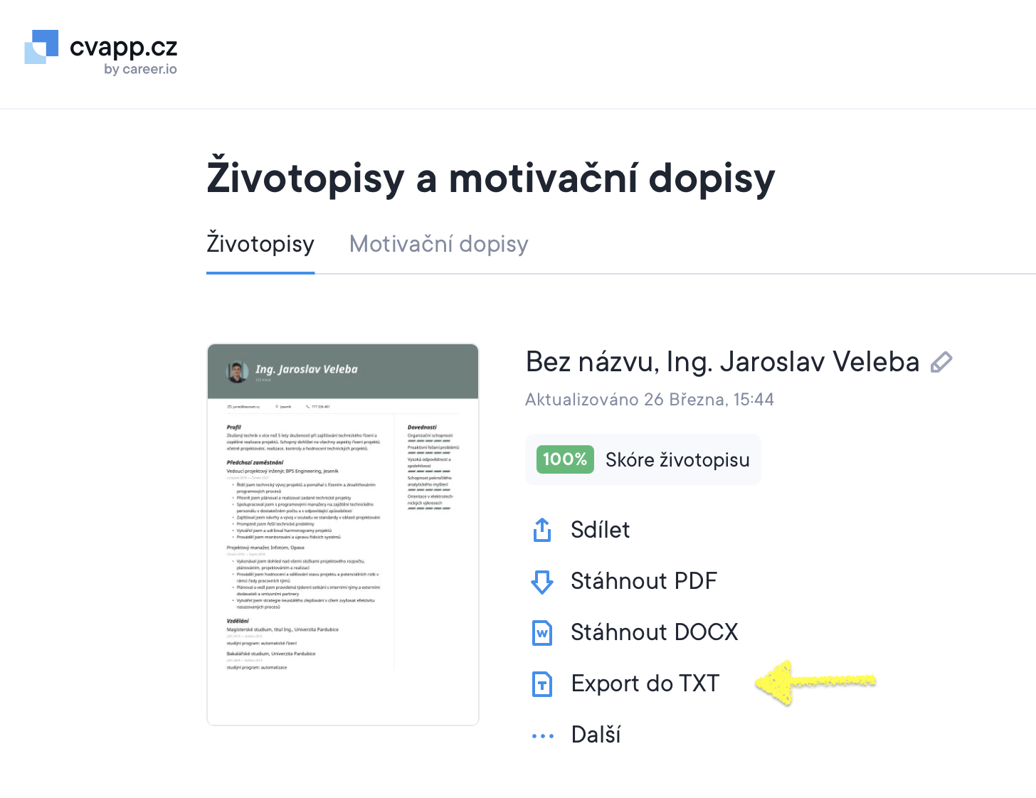 Při využívání bezplatného plánu cvapp.cz si můžete stáhnout svůj životopis jako PDF (s Vancouver šablonou) nebo jako TXT soubor.