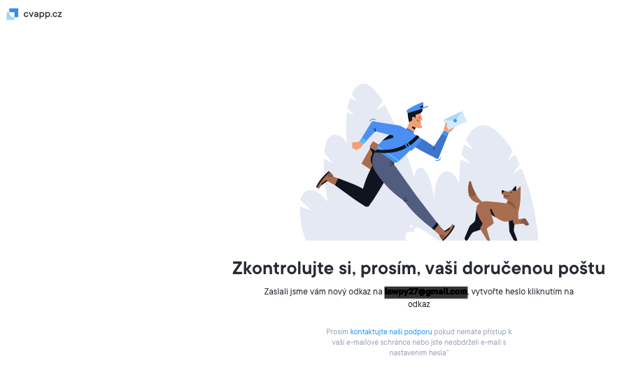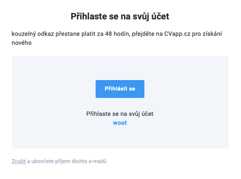 Pokud vaše e-mailová adresa funguje, ale nepřichází vám e-mail s odkazem Magic Link, zkontrolujte složku s nevyžádanou poštou nebo ve složce příchozí pošty zkuste vyhledat „Cvapp.cz“.