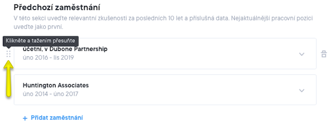 Přeskládejte jednotlivé části* – Každou část pod profesním shrnutím v hlavním sloupci životopisu lze přesunout jinam. Chcete-li změnit pořadí částí, klikněte na ikonu mřížky vlevo od dané části, jak je vidět níže. Poté můžete části přetáhnout nahoru nebo dolů. Viz níže uvedené snímky obrazovky.