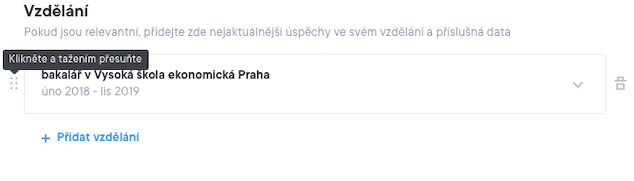 * V současné době není možné změnit konfiguraci rozvržení sekcí s osobními údaji, profesním shrnutím, koníčky nebo dovednostmi. Nelze například přesunout sekci dovedností zprava doleva nebo přidat okraj či zalomení stránky. Doufáme, že v budoucnu bude k dispozici více funkcí pro přizpůsobení rozvržení.