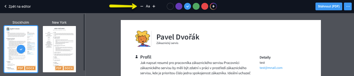 V současné době není možné v životopisu nebo motivačních dopisech upravovat fonty a velikosti písma. Doufáme, že v budoucnu přidáme další funkce pro úpravu fontů. Mezitím navrhujeme experimentovat s různými designy dostupných šablon, kdy každý z nich používá mírně odlišné fonty.
