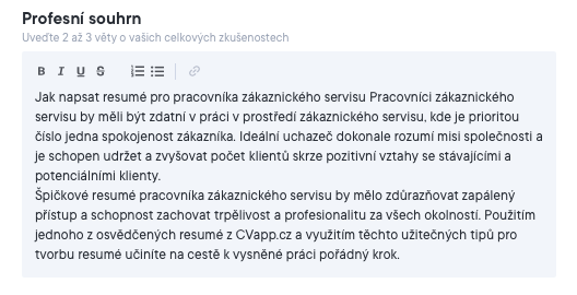 Profesní souhrn je skvělým způsobem, jak zaujmout pozornost čtenáře ve 3 až 4 krátkých větách o vaší kariéře, vhodnosti pro danou pracovní pozici a úmyslech do budoucna.