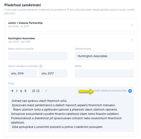 A nezapomeňte! Nyní nabízíme předformulované fráze, které vám pomohou snadněji sestavit váš životopis! Jak to funguje? Při přidávání podrobností do části Předchozí zaměstnání se nyní zobrazí také tlačítko + „Přidat předformulované fráze“. Stačí na něj kliknout, vyhledat konkrétní práci a náš tvůrce životopisů vám pomůže vyhledat potřebné fráze. Rychlé, jednoduché a praktické!