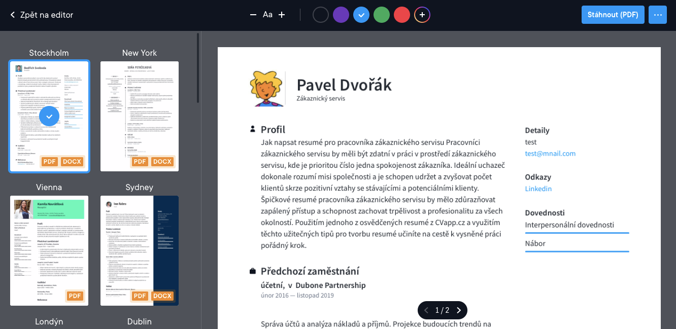 cvapp.cz nabízí několik různých designových témat nebo šablon. Všechna naše témata budou s vaším obsahem bezchybně fungovat, nemusíte si dělat starosti se změnami obsahu tak, aby vyhovoval každému designu zvlášť. Jsme rádi, že pro jednu z našich nejoblíbenějších šablon, "Going to Dublin", je nyní k dispozici funkce exportu Docx(Word).